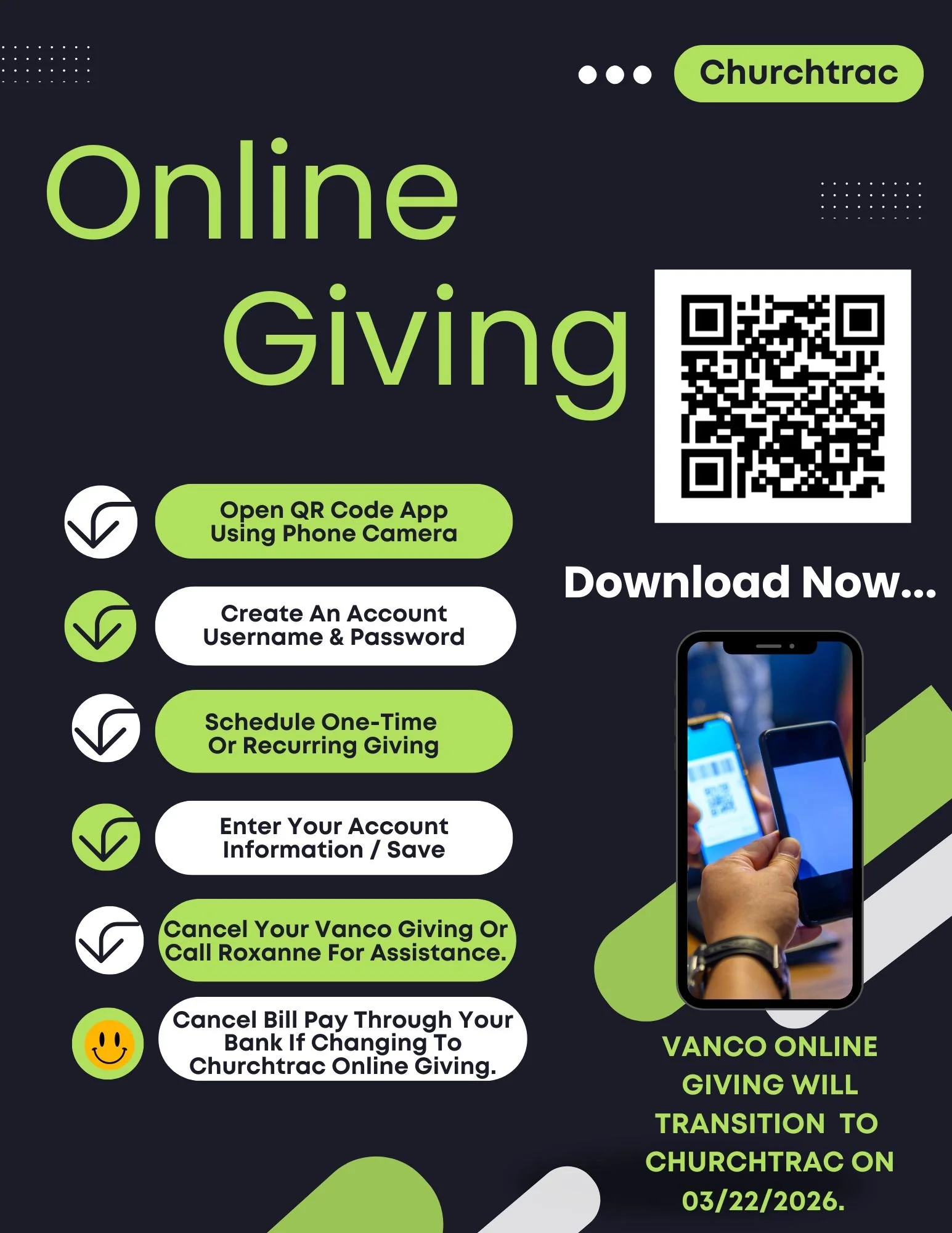 SECOND…As of 03/22/2026, Crosspoint will no longer be using VANCO for online giving. Our new giving platform will be through Churchtrac.