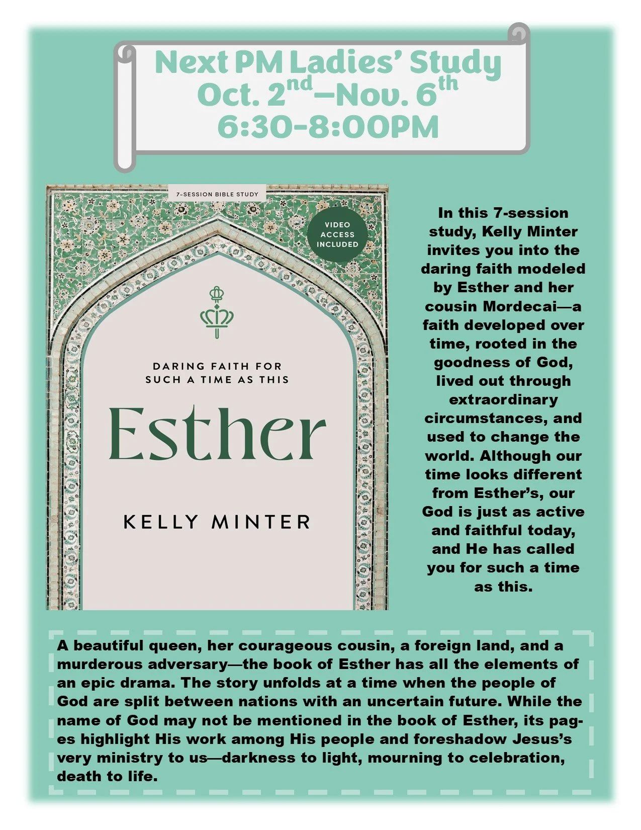 Women’s Study Coordinator: Dori Mitchell (218-371-8729). Connect with Dori at church or give her a call/text if you have questions regarding any of the planned studies. Otherwise, call the church office (218-346-4673) to sign up for a morning or evening study. You can purchase a study guide from the church for any of the studies, just let us know.